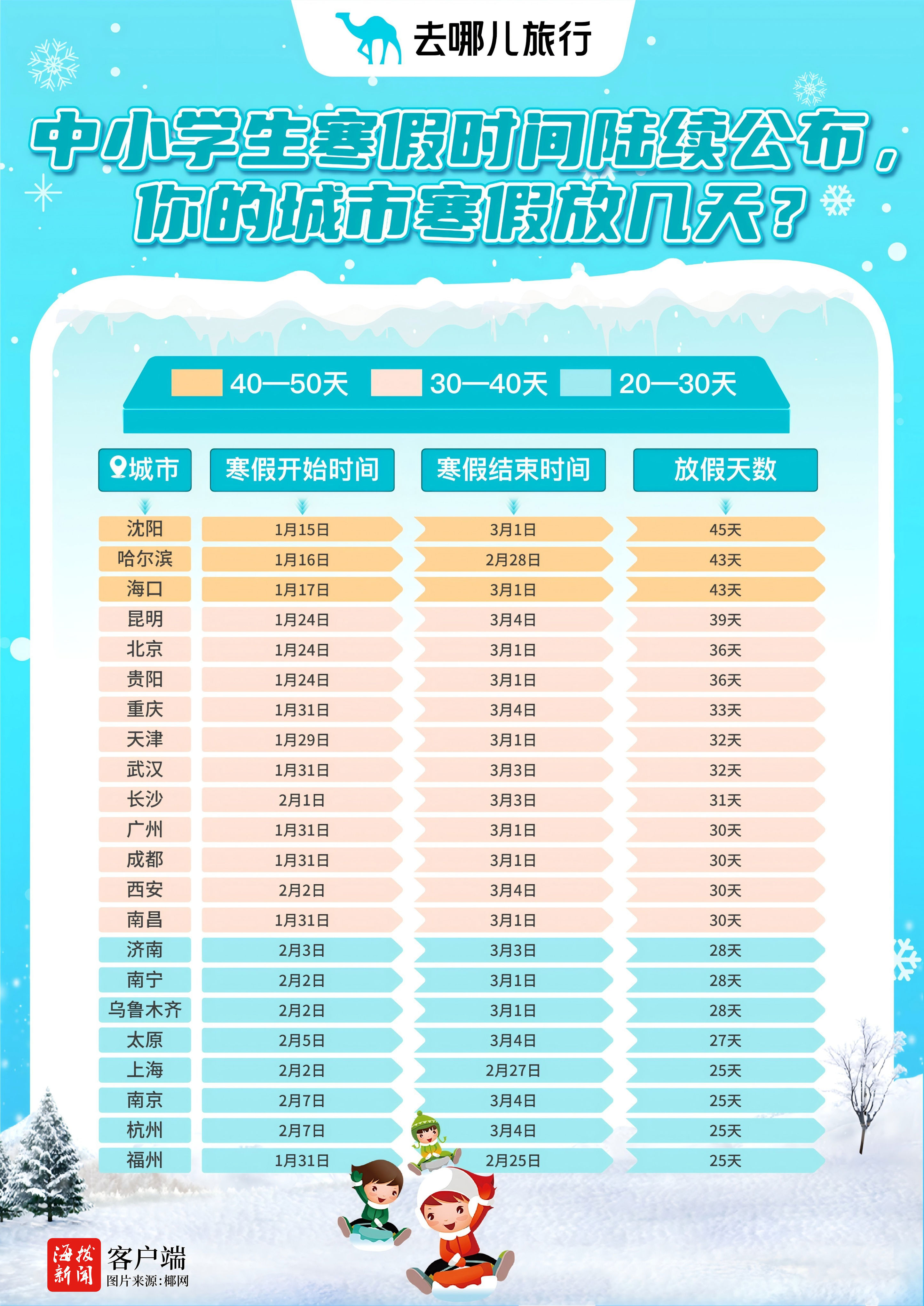 此外,11月以来,各地陆续公布了寒假时间。据统计,今年东北、海南的中小学生,寒假时长都超过了40天。不少家庭选择避开春节高峰驰盈策略,把寒假前半段作为“亲子错峰出游”的最佳时机。