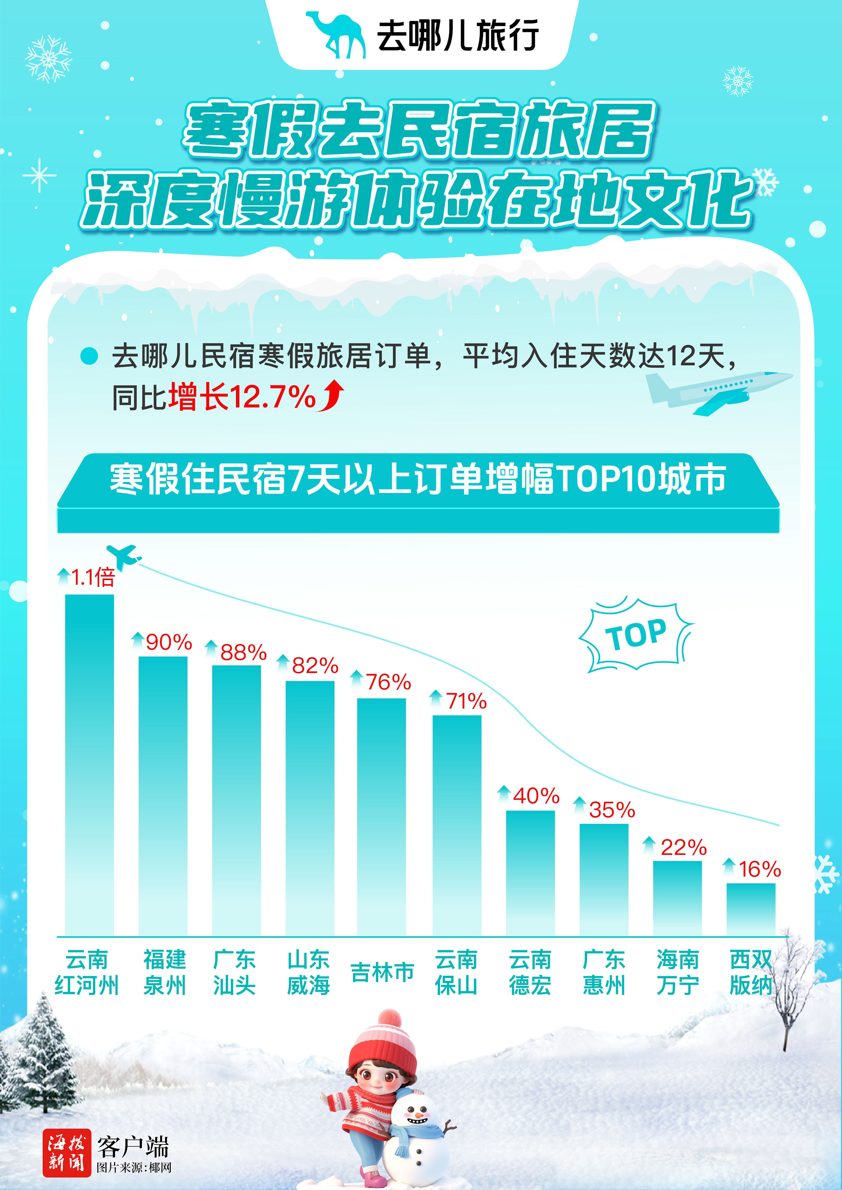 寒假期间,在去哪儿民宿连续入住7天以上的旅居订单同比去年增长11%。热门旅居目的地清一色来自温暖的南方海滨与度假城市,旅居订单最多的城市包括三亚、西双版纳、北海、大理州、广州、昆明、成都、万宁、陵水和惠州。
