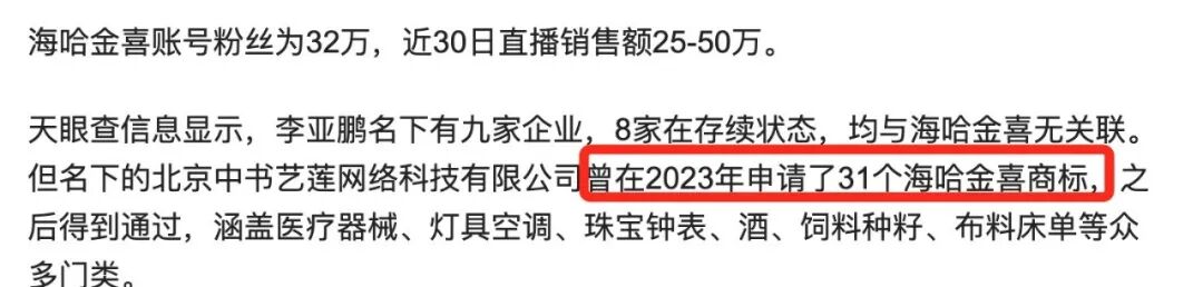 据数据与报道显示,李亚鹏旗下公司于去年集中注册了 31 个以 “海哈金喜” 为名的商标,涵盖医疗器械、酒类等多个领域。