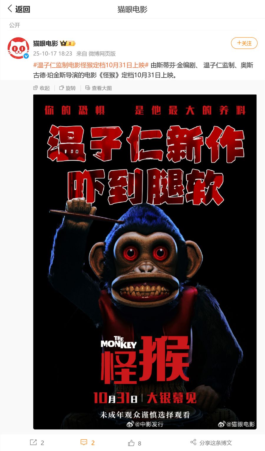 IT之家 10 月 18 日消息金铺子配资,@猫眼电影 昨日(10 月 17 日)发布博文,报道称由斯蒂芬・金编剧、温子仁监制、奥斯古德・珀金斯导演的电影《怪猴》定档 10 月 31 日上映。