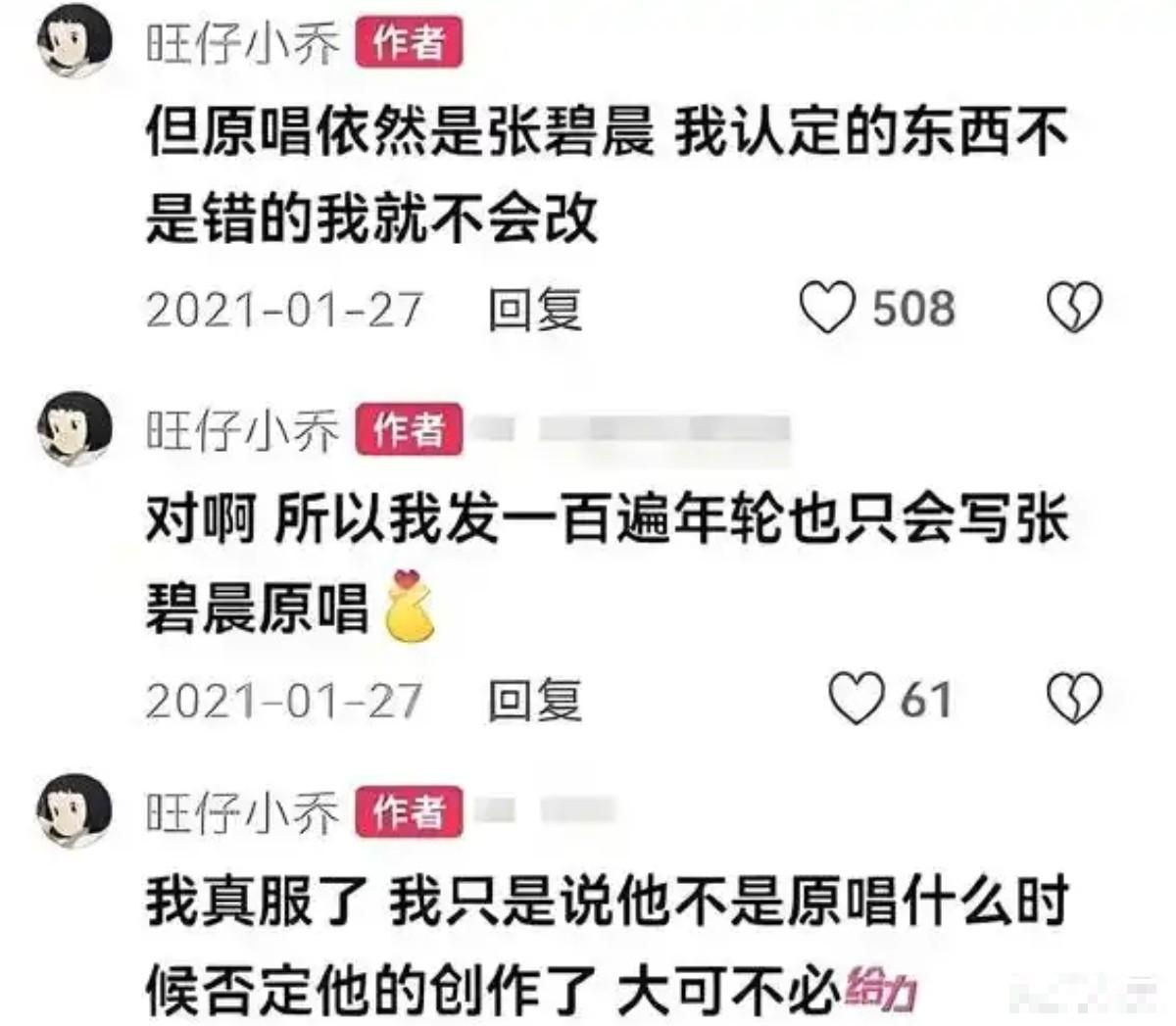 如果不是网红旺仔小乔在直播间称张碧晨是唯一原唱,还多次评论,想必两人也不会在意自己到底是不是第一原唱。