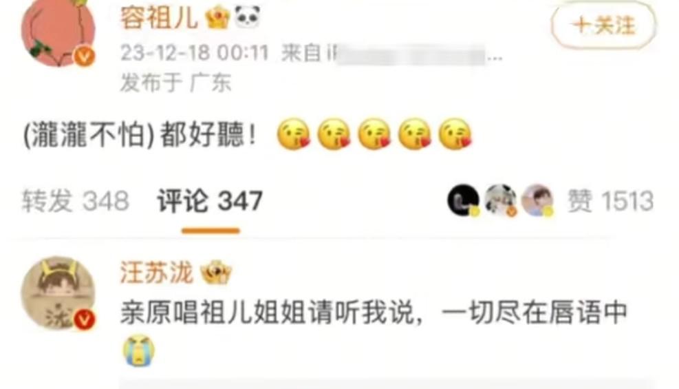 之后两人在社交平台上互动,容祖儿称都好听,求生欲爆棚的汪苏泷连夜跑去评论。