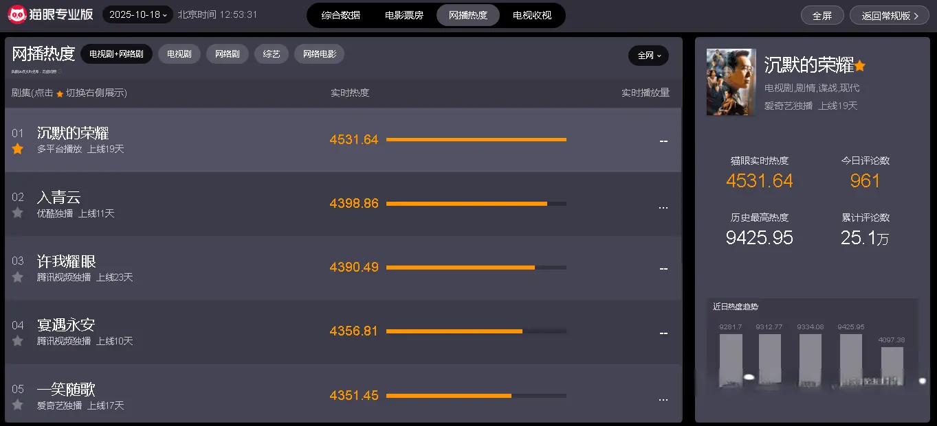 截止10月18日中午12时52分,从“猫眼专业版”实时数据显示可知K8金融,当前热播电视剧中,网播热度最高的五部剧分别如下: