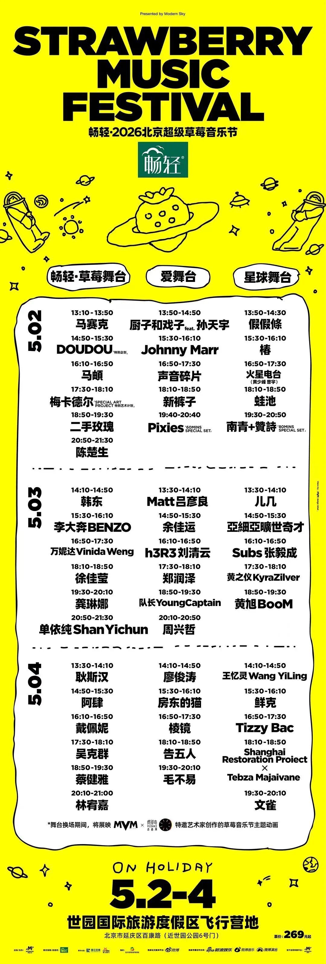 5月2-4日,2026北京超级草莓音乐节将在北京延庆世园公园飞行营地盛大开唱。三天三大主题——传奇首演·摇滚主场、流行金曲·潮流说唱、金曲之声·唱作力量,这里有躁动的音浪、炙热的舞台和自由的灵魂。在「畅轻·草莓舞台」与「爱舞台」的声浪中,与万千乐迷一起,逃离日常,奔赴热爱。尽情摇摆,大声歌唱,在春天里创造独属于你的炽热记忆。2026北京超级草莓音乐节,不见不散!