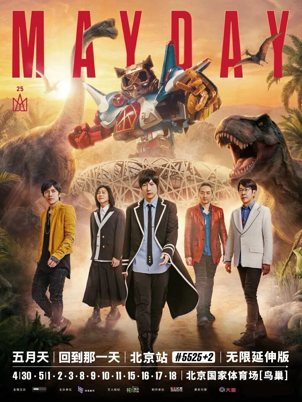 有你的每一天,都是五月天想回到的那一天。[#5525 回到那一天]音乐旅程自2023年底起跑,历经四个年份,精彩灿烂写下无数难忘的现场新回忆。五月天[ #5525+2 回到那一天]25周年巡回演唱会 北京站·无限延伸版,2026.04.30-05.03,05.08-05.11,05.15-05.18,于北京国家体育场(鸟巢),旗舰主题再进化#5525+2!本次主题巡演在鸟巢首度开设横向舞台,也将有惊喜彩蛋新角色恐龙现身,将鸟巢打造成欢乐侏罗纪概念的未来奇幻Maydayland。寒武纪到侏罗纪到新世纪,五月天陪你再活一千个世纪!